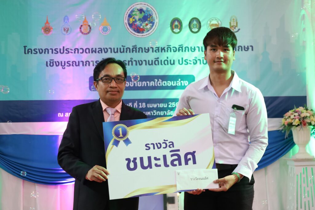 รางวัลชนะเลิศ ได้แก่ นายสันติสุข ปานแก้ว คณะวิทยาศาสตร์และเทคโนโลยีอุตสาหกรรม วิทยาเขตสุราษฎร์ธานี โครงงานเรื่อง Conduct validation study of the halogen moisture Analyzer against conventional method using oven for The moisture content analysis of desiccated coconut.#