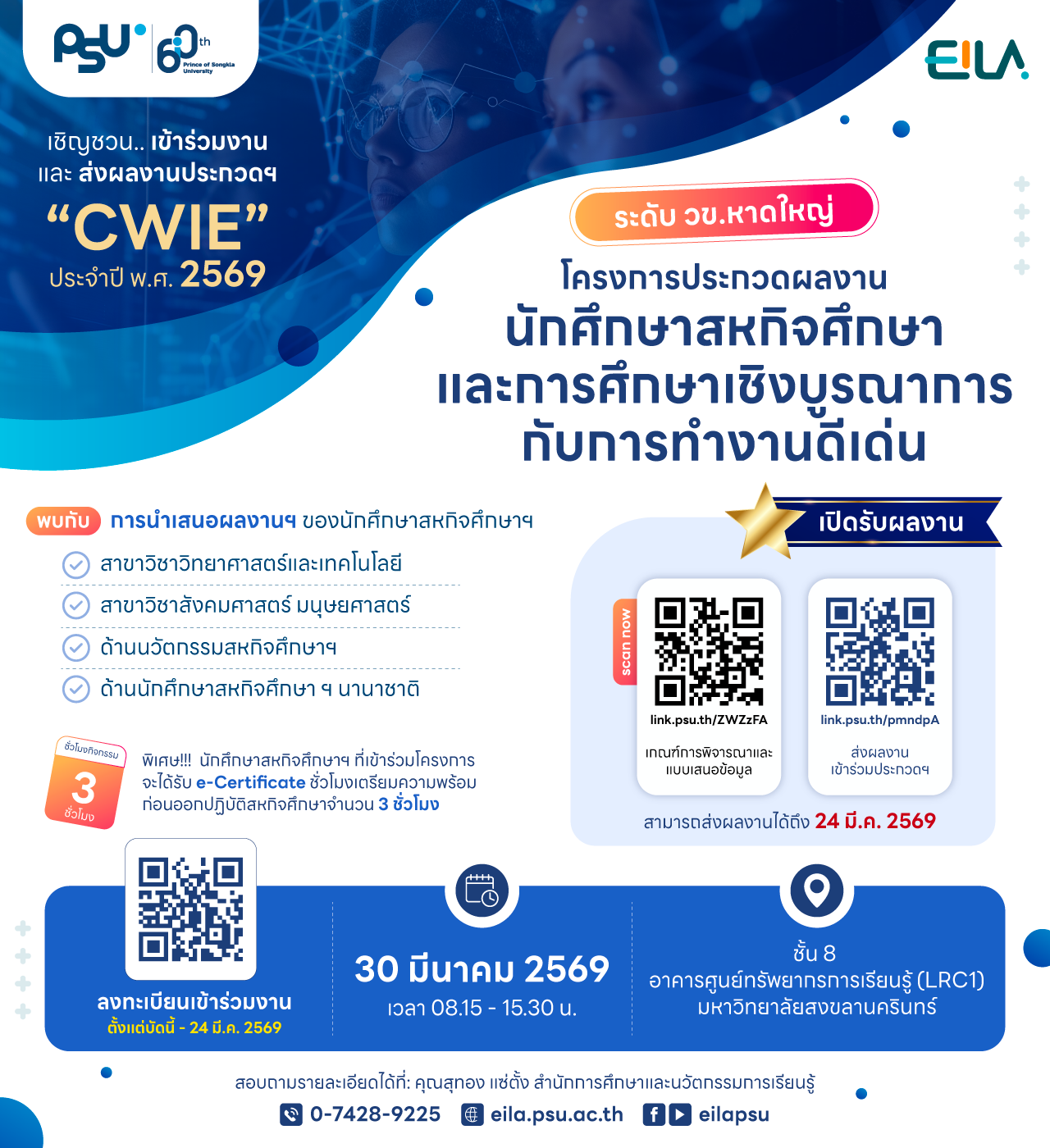 เชิญชวน นศ.สหกิจศึกษาฯ ส่งผลงาน และเข้าร่วมงาน “ประกวดผลงานนักศึกษาสหกิจศึกษาและการศึกษาเชิงบูรณาการกับการทำงานดีเด่น” ประจำปี พ.ศ. 2569 ระดับวิทยาเขตหาดใหญ่