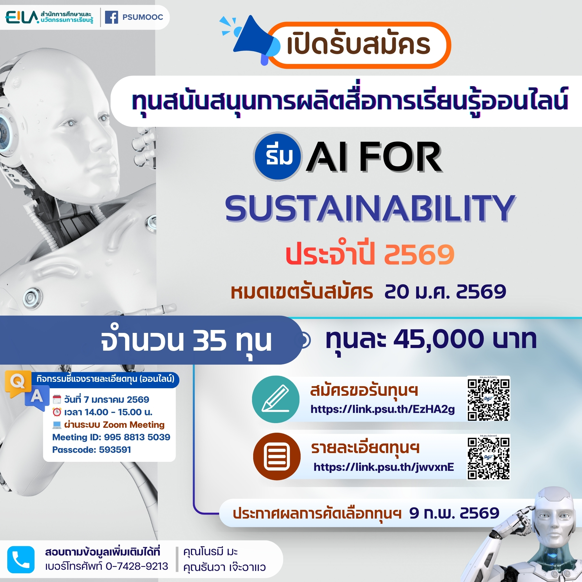 สำนักการศึกษาและนวัตกรรมการเรียนรู้ (EILA) เปิดรับสมัครเพื่อคัดเลือกผู้รับทุนสนับสนุนการผลิตสื่อการเรียนการสอนออนไลน์ PSU MOOC ตามประกาศมหาวิทยาลัยสงขลานครินทร์ เรื่อง ทุนสนับสนุนการผลิตสื่อการเรียนรู้ออนไลน์ PSU MOOC เพื่อส่งเสริมการเรียนรู้ตลอดชีวิต ประจำปี 2569 ภายใต้แนวคิด “AI for Sustainability” มุ่งส่งเสริมการพัฒนาสื่อการเรียนรู้ที่บูรณาการเทคโนโลยีปัญญาประดิษฐ์ (AI) เพื่อสร้างความยั่งยืนทางการศึกษา สังคม และสิ่งแวดล้อม พร้อมตอบโจทย์การเรียนรู้ในศตวรรษที่ 21