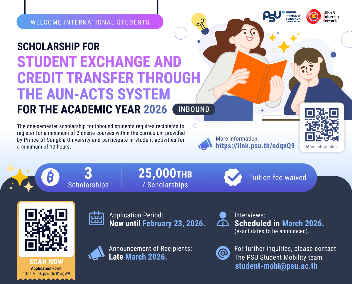 Prince of Songkla University (PSU) offers scholarships to students from AUN-ACTS member universities to participate in the exchange program at the university, aimed at fostering international learning experiences and promoting knowledge and cultural exchange among member universities. These scholarships promote student participation in exchange programs and credit transfers facilitated by the ASEAN Credit Transfer System (ACTS). The scholarship details are as follows:
