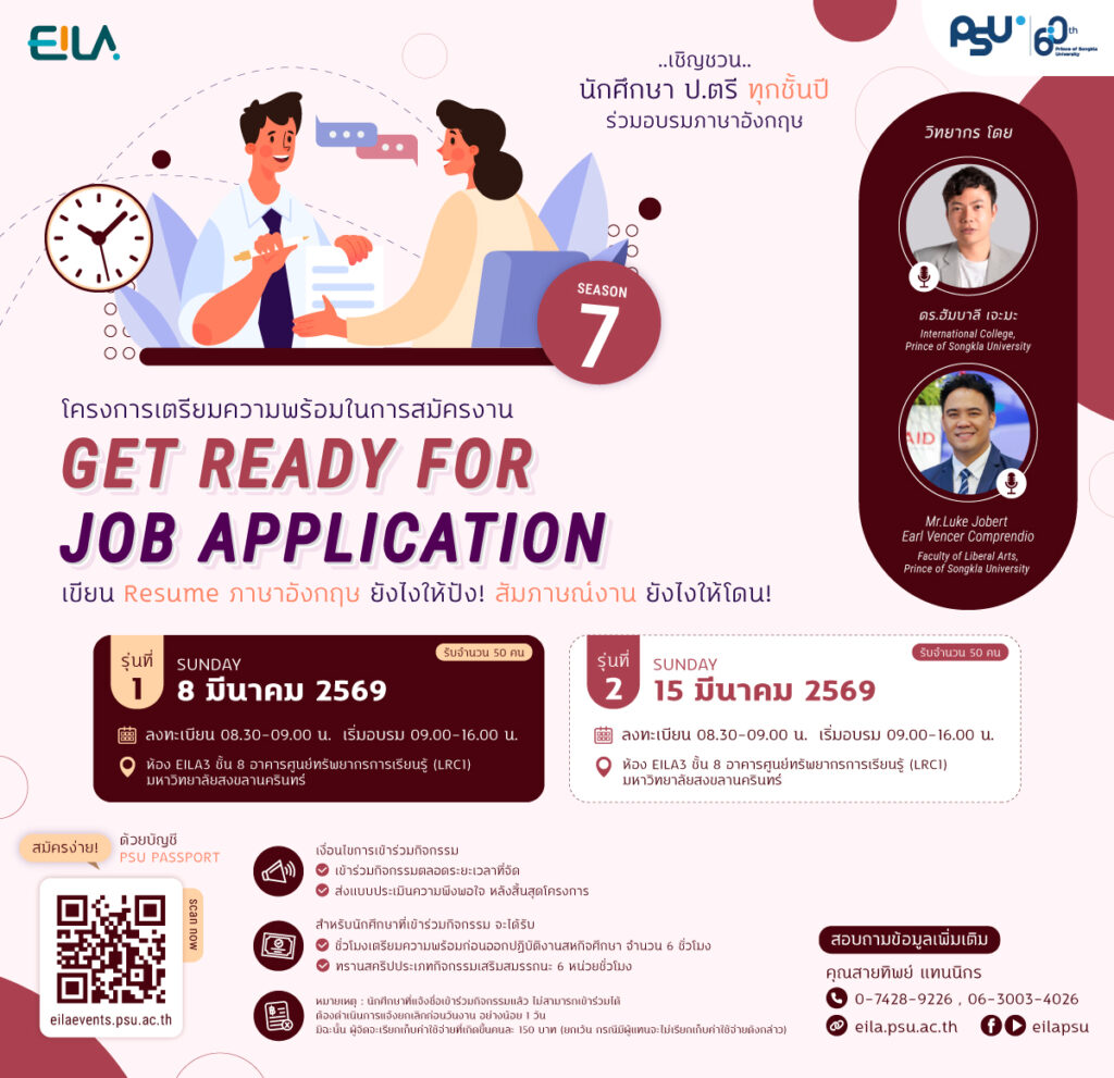 เชิญชวนนักศึกษาร่วมโครงการเตรียมความพร้อมในการสมัครงาน (Get ready for job application) “การเขียน Resume ภาษาอังกฤษยังไงให้ปัง สัมภาษณ์งานให้โดน” Season 7 (รุ่นที่ 1-2)